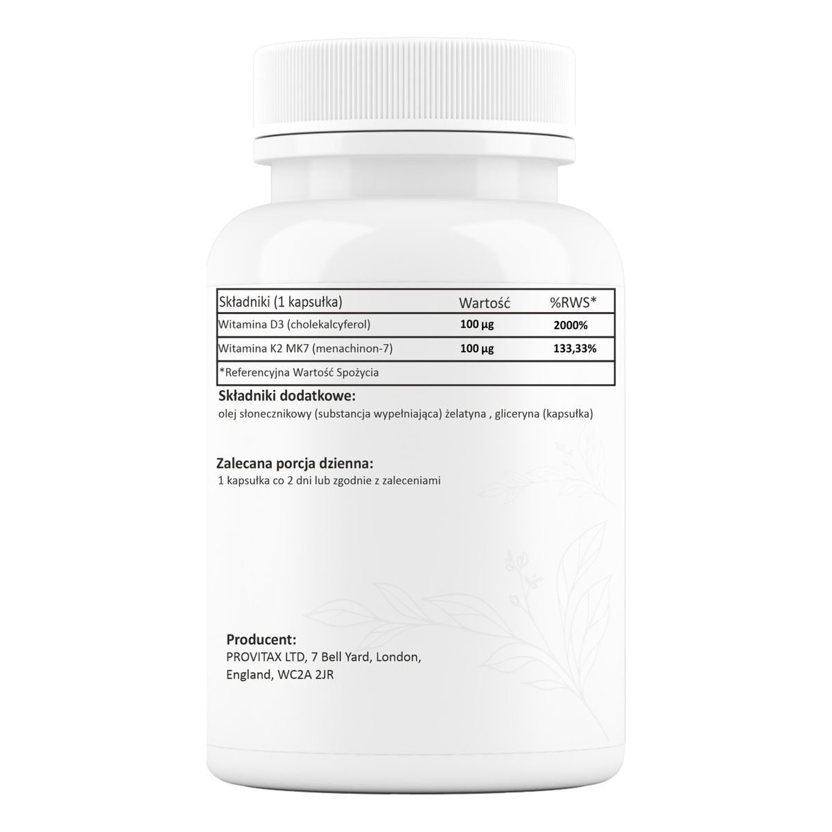 - Wsparcie zdrowia kości i zębów – witamina D3 pomaga w prawidłowym wchłanianiu wapnia, a witamina K2 wspiera jego właściwe wykorzystanie w organizmie.